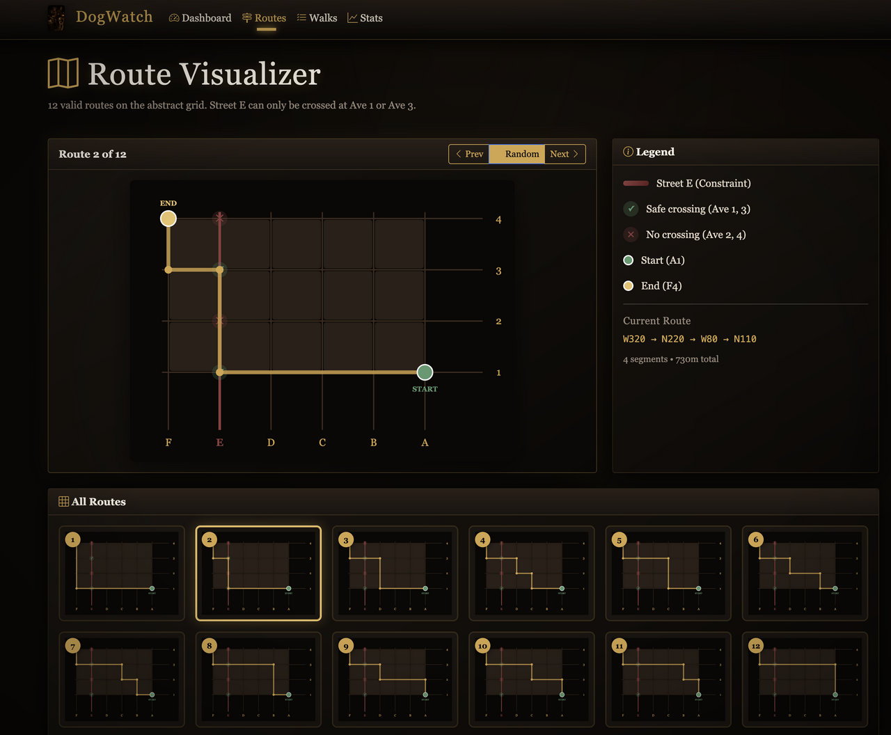 The watch needed to pick a random route. We can only cross Street E at the lights on 4th and 2nd. Everything else is fair game. I mapped twenty-four possible routes.